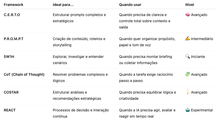 Aqui, vamos revisar e aprofundar os principais frameworks que ajudam você a se comunicar melhor com a IA — do mais simples ao mais estratégico.