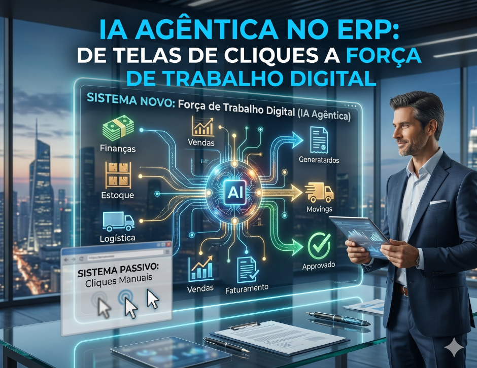 Vamos direto ao ponto. A IA Agêntica colocou o verbo no centro da operação. Historicamente, o ERP era uma tela passiva que implorava por cliques humanos para funcionar. Hoje, com a integração de agentes autônomos, ele deixa de ser uma tela que pede cliques e se transforma em uma camada inteligente que empurra ações. O sistema agora percebe o contexto, planeja, decide e executa múltiplas etapas por conta própria.